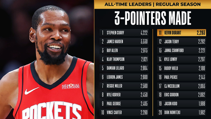 杜兰特半场命中三记三分,生涯三分数来到2284个,超越贾森·特里,升至NBA历史第11,排在第10的是文斯·卡特(2290个)。