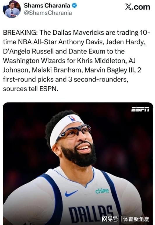 "轰!"当Shams的爆料如惊雷般炸响,整个篮球世界瞬间沸腾——独行侠竟将浓眉哥安东尼·戴维斯、拉塞尔、哈迪和埃克萨姆打包送往华盛顿,换回米德尔顿领衔的七人豪礼(含5个选秀权)!这记堪比好莱坞大,让无数球迷扼腕叹息:我们终究无缘见证欧文(2011状元)+弗拉格(2025状元热门)+浓眉哥(2012状元)的梦幻三状元组合!